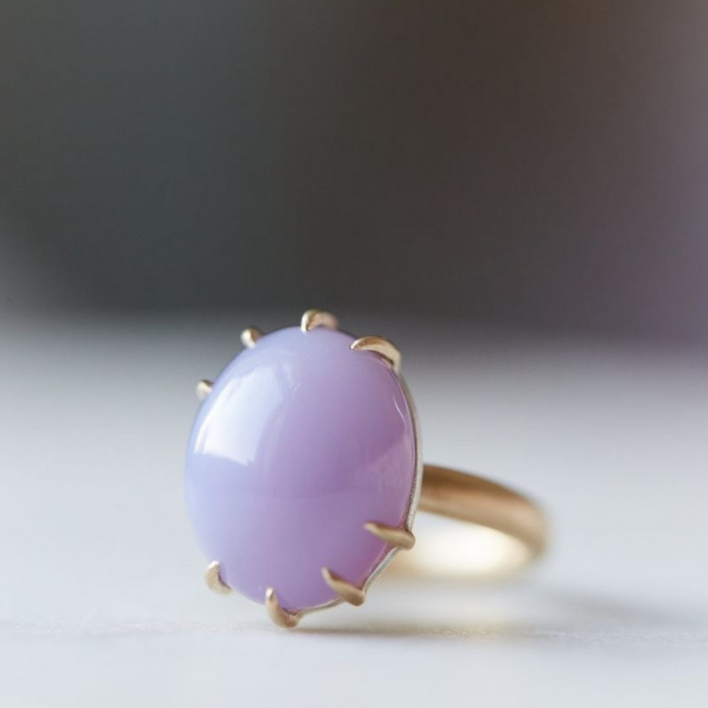Cherish nature's beautiful offerings with Hannah Blount Jewelry! Her simple, sophisticated aesthetic charms its way through her nature-inspired designs. This one-of-a-kind vanity ring is made of 14k yellow gold and fine silver with a cabochon lilac chalcedony that weighs 13.05cts and measures 0.5" wide and 0.75" tall. The ring size is 7 (can be sized). Handcrafted in US.