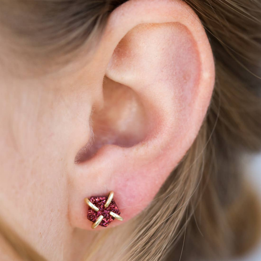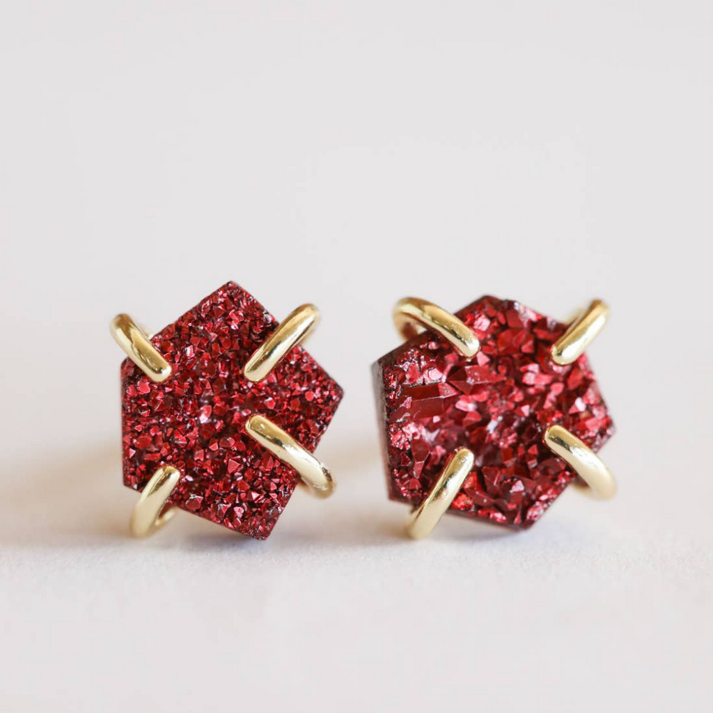 Burgundy druzy stones are set into a simple four-prong 18k yellow gold plated setting over sterling silver by JaxKelly. Measures approximately 0.25". Each stone is unique and varies slightly in color and size. Handmade in US.