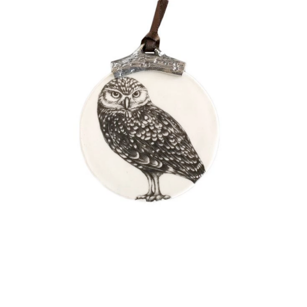 Welcome to the charm and serenity that is nature into your home with a beautiful Laura Zindel piece! This ceramic ornament adorns the artist's original illustration of a burrowing owl and is topped with a pewter branch. Measures 2.5 inches in diameter. Handcrafted in US.