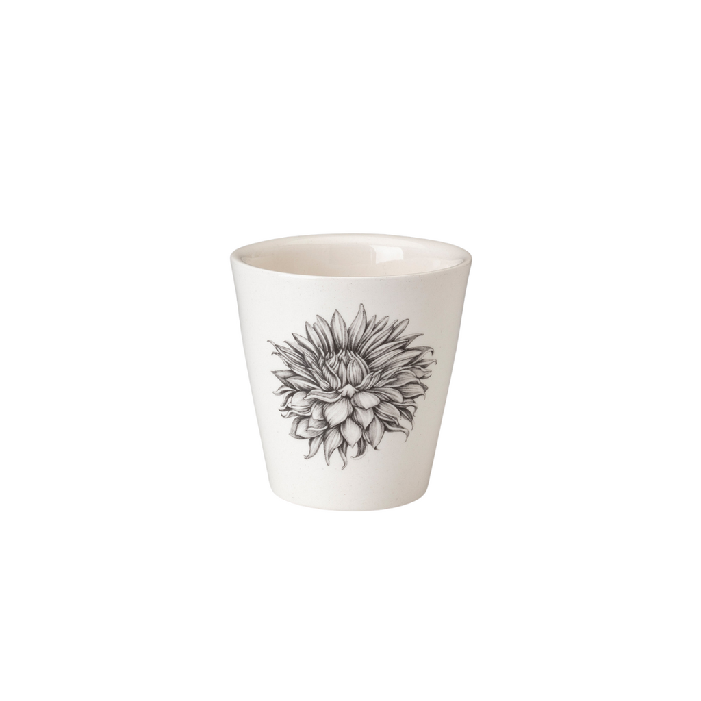 Welcome to the charm and serenity that is nature into your home with a beautiful Laura Zindel piece! Both functional and decorative, this bistro cup adorns the artist's original illustration of a cactus dahlia. Made from earthenware and glazed with non-toxic, low-fire glazes. Measures 3.5" tall and holds 7 oz liquid. Handcrafted in US. Hand wash only in warm soapy water with a non-abrasive cloth; they should not be placed in the oven, microwave, or dishwasher.