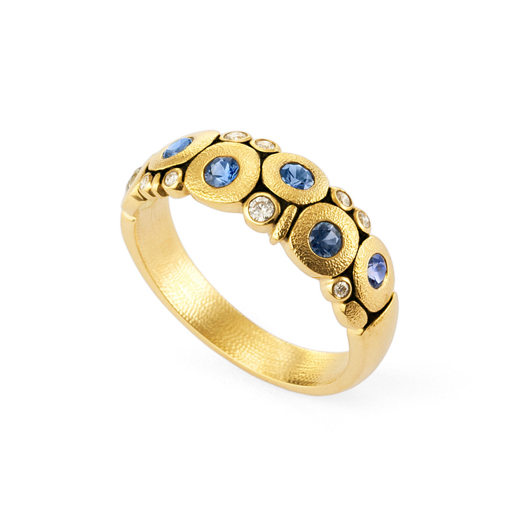 Enjoy the unique world that is Alex Sepkus! Treasure the designer's exquisite, museum-quality jewelry with his distinctive design elements and textures. This 18k yellow gold Candy Ring (R-122S) has nine round brilliant cut diamonds with a total weight of 0.12 carats (F-G color, VVS clarity) and blue sapphires in various hues with a combined total weight of 0.50ct. The ring size is 7.25. Can be resized or special ordered in a different size ~ please contact us for details. Handcrafted in US.