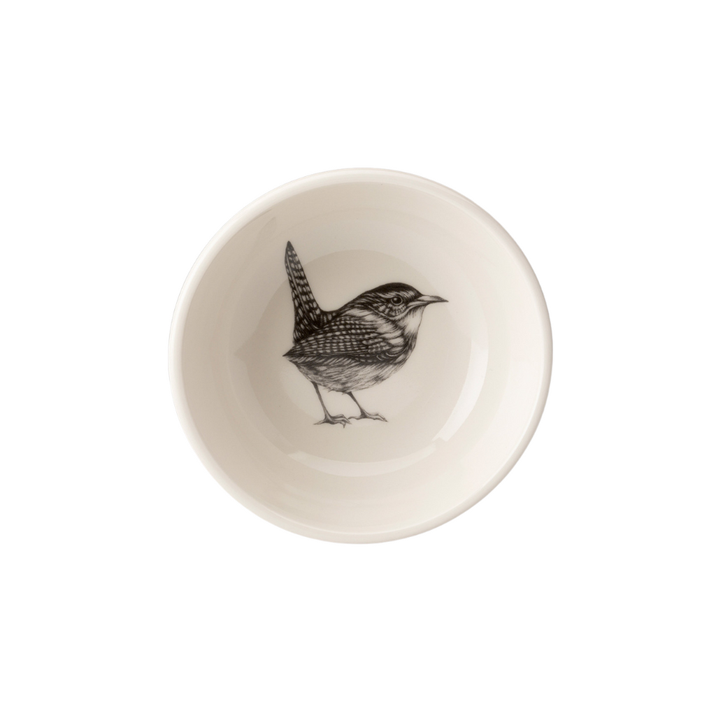 Welcome to the charm and serenity that is nature into your home with a beautiful Laura Zindel piece! Both functional and decorative, this bowl adorns the artist's original illustration of a Carolina Wren. Made from high-resistance white china. Measures 5.5" wide and 2" deep. Microwave and dishwasher safe. Handcrafted in US.