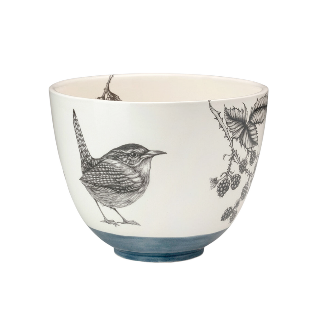 Welcome to the charm and serenity that is nature into your home with a beautiful Laura Zindel piece! Both functional and decorative, this medium bowl, with blue accent color, adorns the artist's original illustration of a carolina wren. Made from earthenware and glazed with non-toxic, low-fire glazes. Measures 7.25 x 5.5 inches. Handcrafted in US. Hand wash with warm soapy water. Avoid dishwasher, oven, or microwave use.