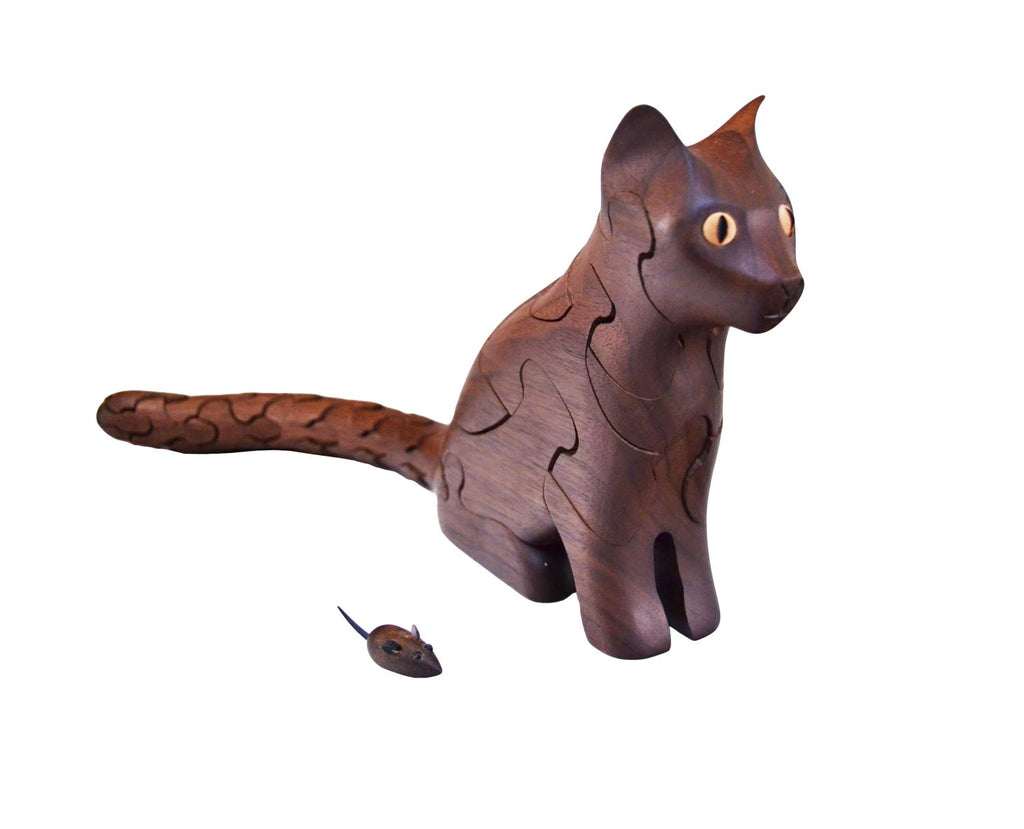 Find your inner child with 3D wooden puzzles by Peter Chapman! Each puzzle is hand sculpted from a single piece of wood, and hides a secret object inside. This cat and mouse puzzle is made of walnut and measures 7” x 12.5”.