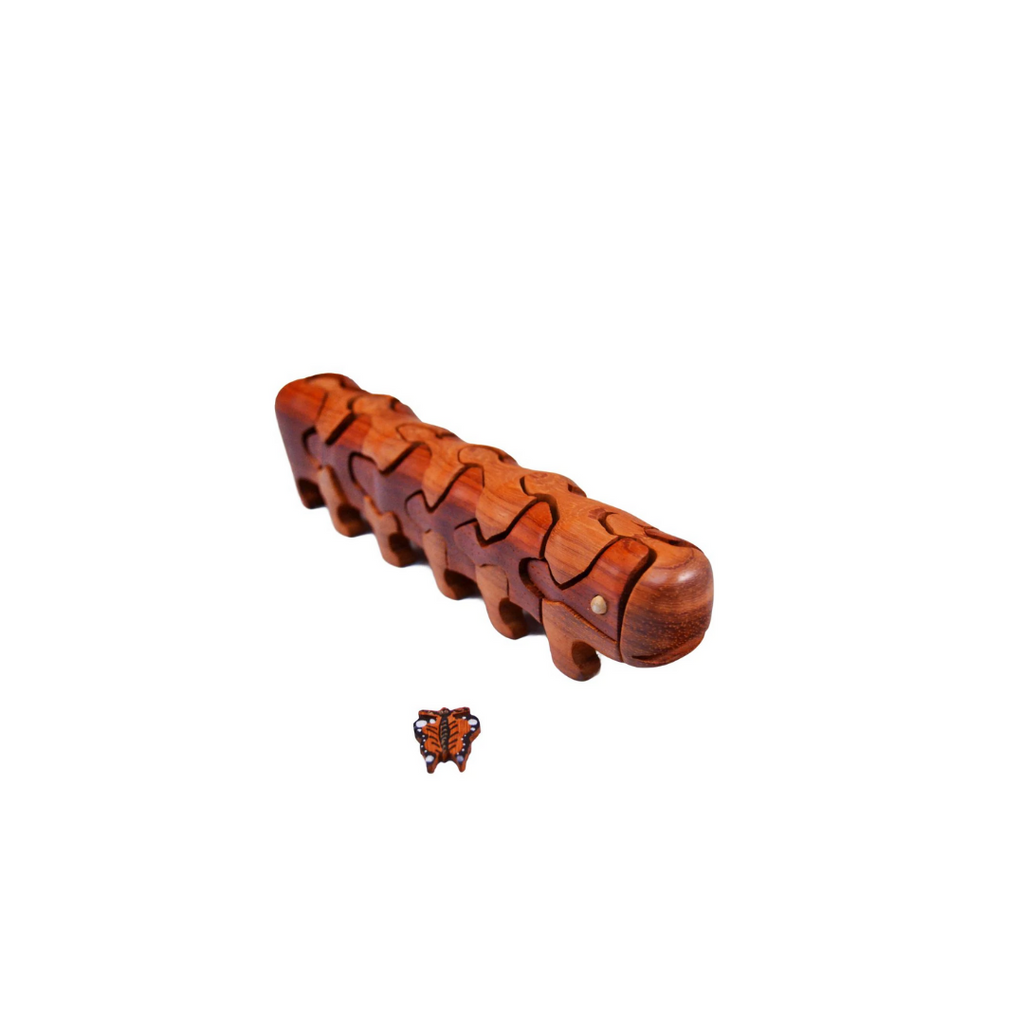 Find your inner child with 3D wooden puzzles by Peter Chapman! Each puzzle is hand sculpted from a single piece of wood, and hides a secret object inside. This caterpillar with butterfly puzzle is made of paduak and measures 8”.