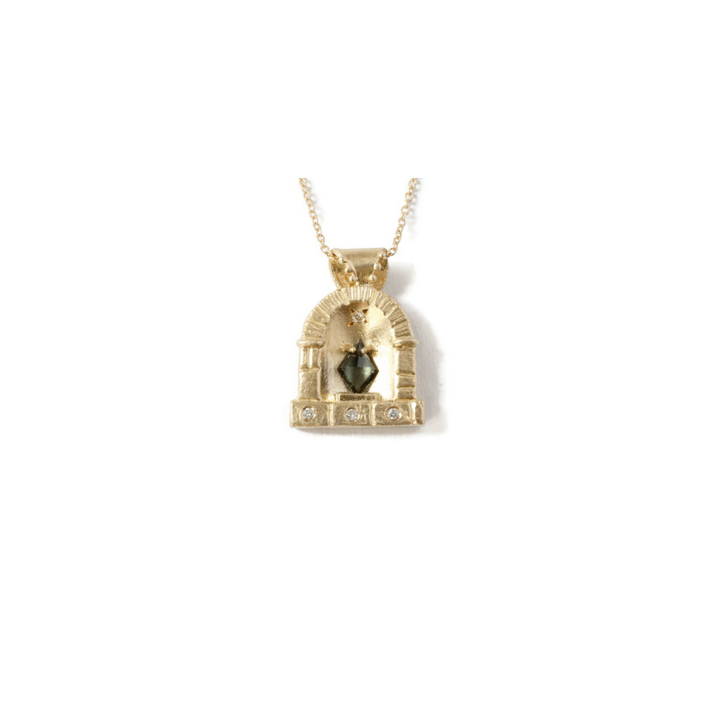 Inspired by years of travel and working in the fashion industries in Japan and New York, designer Masumi Hayashi's work features geometric structures combined with organic forms found in nature, sharp silhouettes, balanced asymmetry, and richly textured gold often set with irregular and unique gemstones. The Cathedral necklace is made of recycled 10k yellow gold. The pendant is set with a spinel center stone and features four little diamonds. The pendant measures 0.75" tall and 0.6" wide and is suspended on a 16" chain. Handcrafted in US.