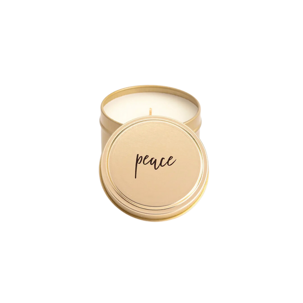 The Peace travel tin candle by Prosperity Candle will bring warmth and delight to any space. The small size makes it easy to take on the go and it makes a great hostess gift too! To celebrate peace, the candle is infused with tobacco leaf blended with bergamot and notes of cinnamon, clove and amber. Each candle is 4 oz (3" wide and 2" high) and burns about 25 hours. Comes in a recyclable gold aluminum tin. Hand poured by refugee women locally in Easthampton, MA.
