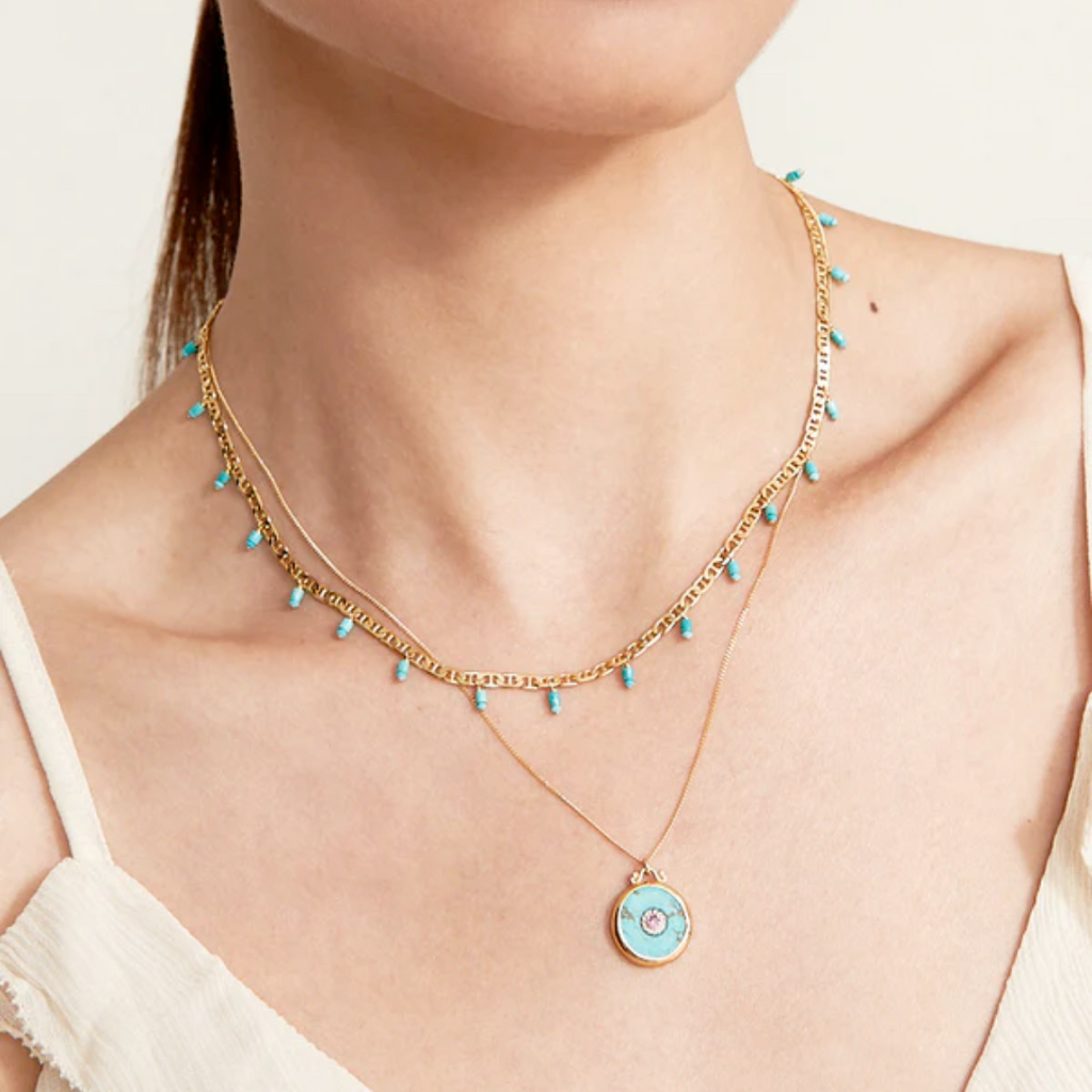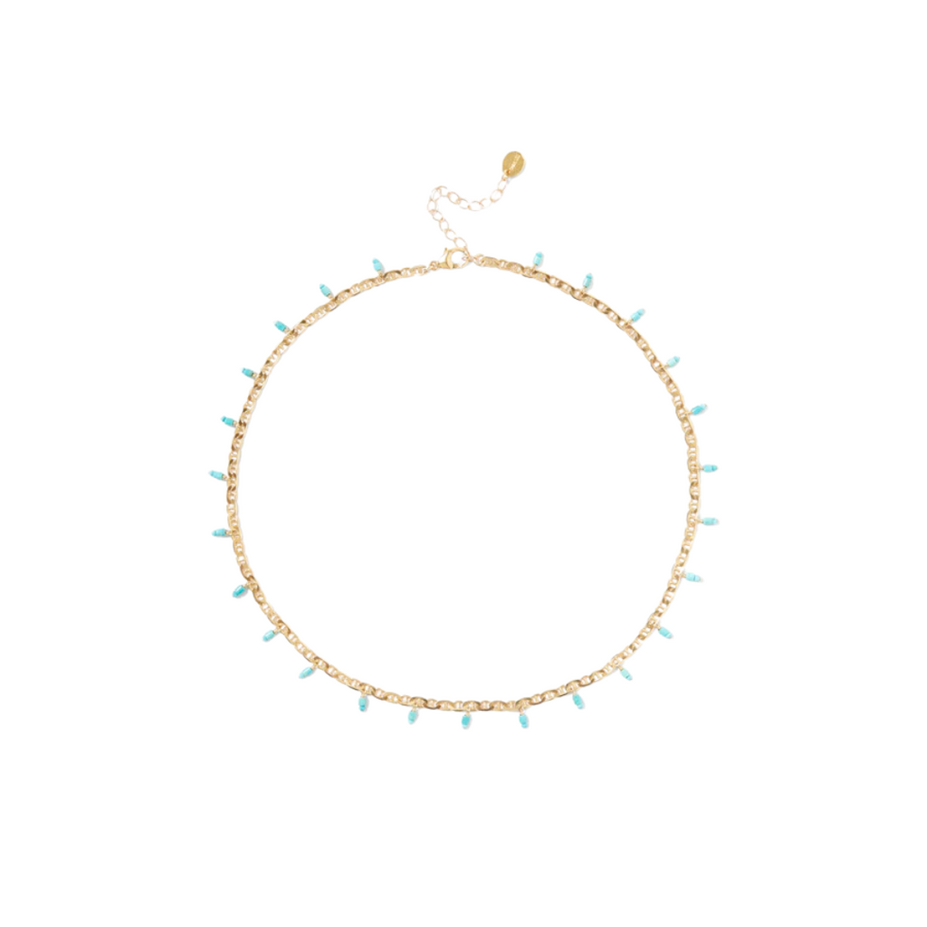 Make this Chan Luu necklace your favorite, go-to accessory! Elegant and eye catching, this necklace features a classic 18k gold plated sterling silver flat curb chain dotted with 0.25" turquoise drops. The necklace can be worn from 16-18", so it can be worn elegantly alone or layered with another necklace. Handmade in Vietnam.