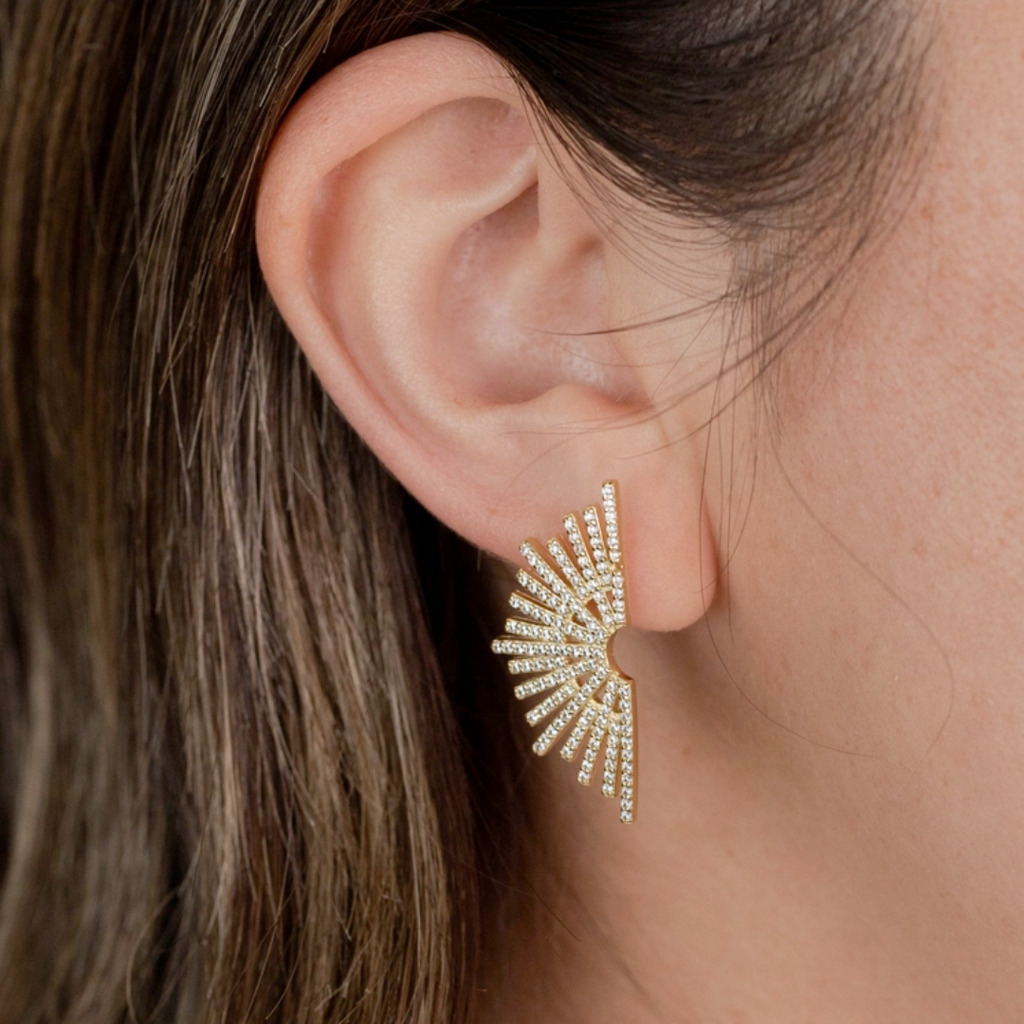 The celestial sunburst studs by JaxKelly are just what you need to add a bold sparkle to your outfit. These earrings feature a large sunburst pattern of pave set cubic zirconia, and are made of 18ky gold plate over brass with sterling silver posts. Measures apprximately 1.18" by 0.55". Handcrafted in US.