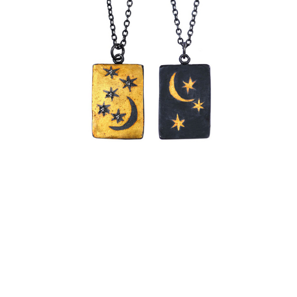 This celestial tag pendant by Acanthus is double-sided, featuring a moon and five diamond-studded six point stars on one side and three stars and a moon on the other. The jewelry's edgy style and organic aesthetic lend themselves to the piece's unique and mysterious vibe. Using an ancient Korean gilding technique, this necklaces is made of oxidized sterling silver and 24k yellow gold. Since the 24ky accents are hand cut and hand placed, variations may occur. The pendant measures 0.69” wide and 1.13” tall and the oxidized silver chain can be worn at both 16” and 18”. Handcrafted in US.