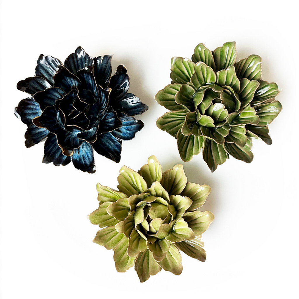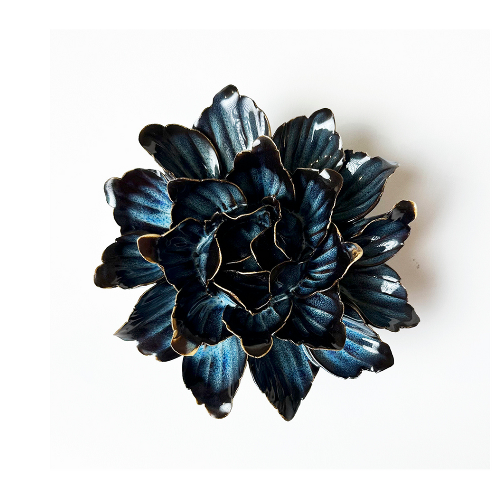This ceramic tree peony by Chive looks great displayed on the wall or on the table! Hand made and glazed with a beautiful blue glaze, this flower measures approx. 5.5" x 5.5" x 2.3". Keyhole in the back makes for simple hanging with a screw. Mix and match with a variety of color and size flowers to curate a unique collection!
