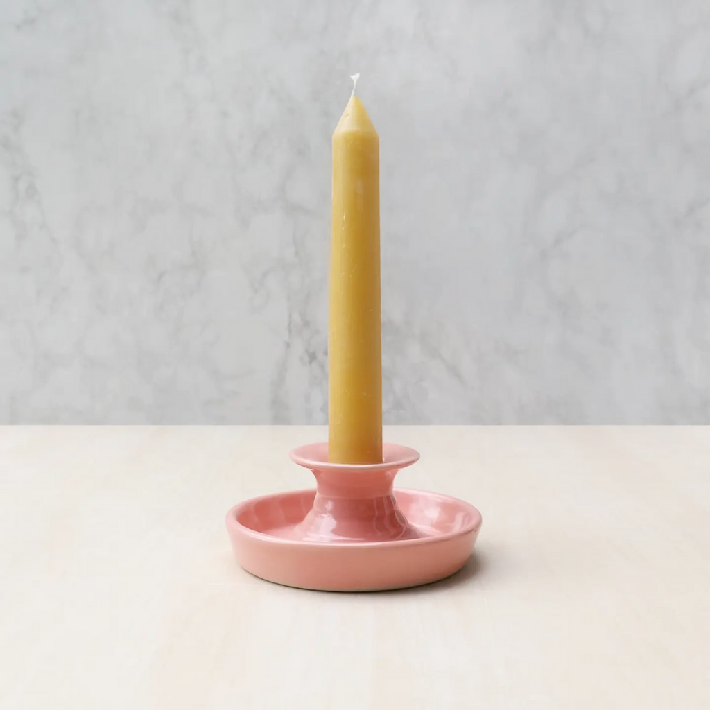 This vintage-inspired ceramic candlestick holder by Stuck in the Mud is lovely in its simple and quiet design. Perfect for any space including your dining table, dresser, or side table. The candle holder is created one at a time on a potter's wheel, which is then glazed and fired. Measures approximately 3" wide and 1.75" tall. Great singly or as a set. Pair it with one of the tapered candles by Danice Design! Handmade in US.
