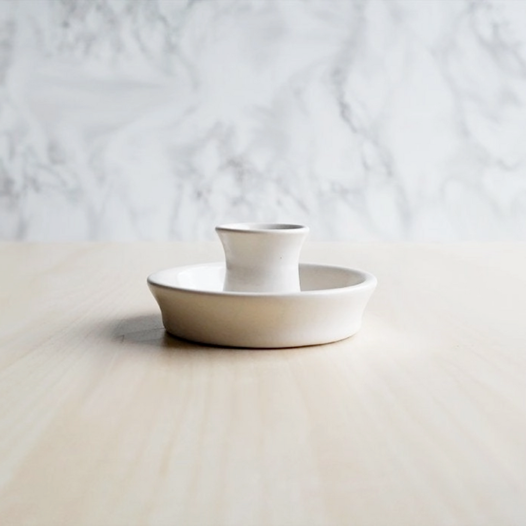 This vintage-inspired ceramic candlestick holder by Stuck in the Mud is lovely in its simple and quiet design. Perfect for any space including your dining table, dresser, or side table. The candle holder is created one at a time on a potter's wheel, which is then glazed and fired. Measures approximately 3" wide and 1.75" tall. Great singly or as a set. Pair it with one of the tapered candles by Danice Design! Handmade in US.