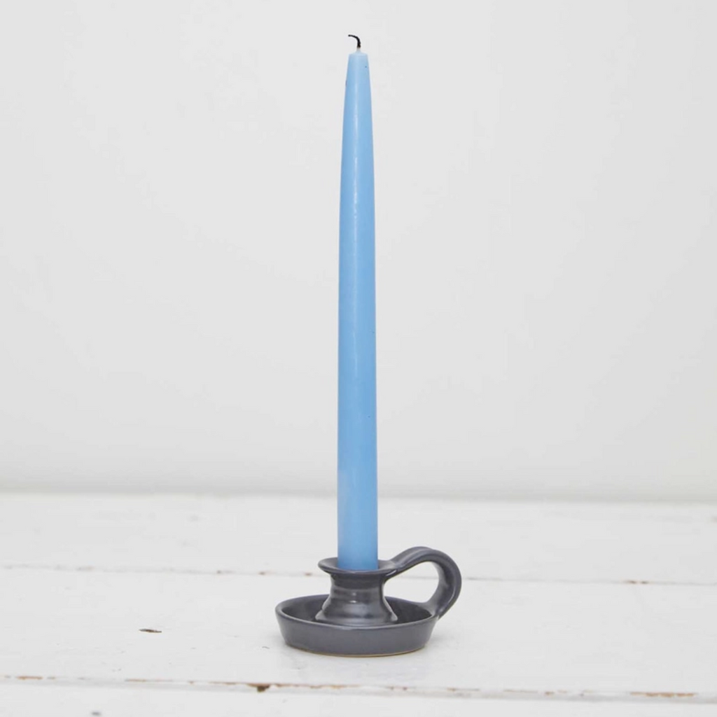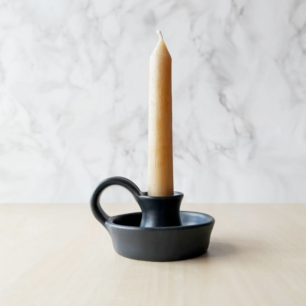 This vintage-inspired ceramic candlestick holder by Stuck in the Mud is lovely in its simple and quiet design. Perfect for any space including your dining table, dresser, or side table. This version has a handle that is reminiscent of the old chambersticks. The candle holder is created one at a time on a potter's wheel, which is then glazed and fired. Measures approximately 3" wide and 1.75" tall. Great singly or as a set. Pair it with one of the tapered candles by Danice Design! Handmade in US.