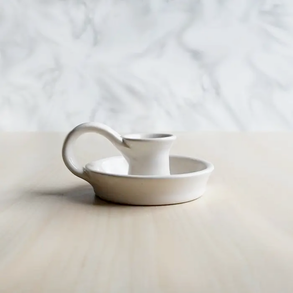 This vintage-inspired ceramic candlestick holder by Stuck in the Mud is lovely in its simple and quiet design. Perfect for any space including your dining table, dresser, or side table. This version has a handle that is reminiscent of the old chambersticks. The candle holder is created one at a time on a potter's wheel, which is then glazed and fired. Measures approximately 3" wide and 1.75" tall. Great singly or as a set. Pair it with one of the tapered candles by Danice Design! Handmade in US.
