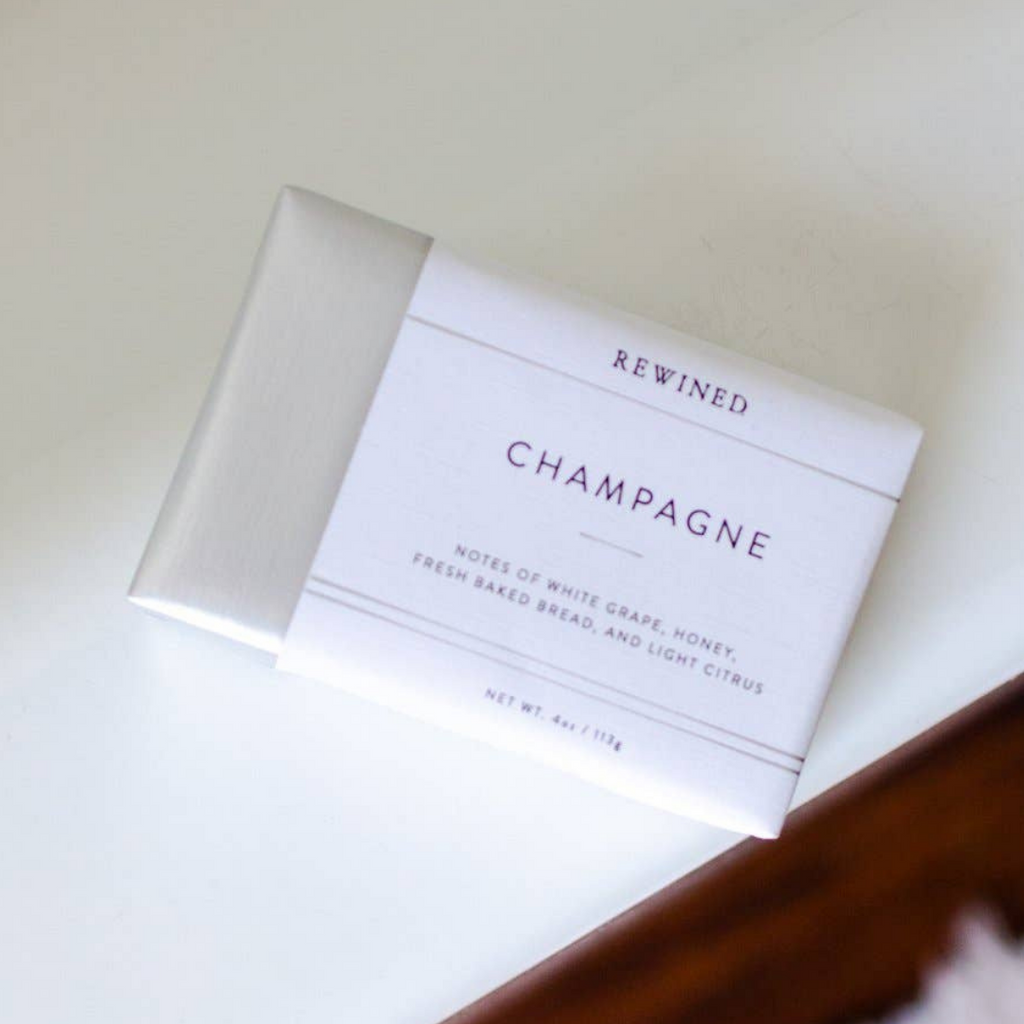 Rewined soap is a milled processed soap made with a blend of natural oils, glycerin, and custom blended fragrances to mimic your favorite wine. Champagne has notes of grape, honey, fresh baked bread, and light citrus. This 4 oz bar of soap is packaged in silver foiled linen paper. Handmade in Charleston, SC. Ingredients: sodium palmate, sodium cocoate, water, glycerin, fragrance, olea europaea (olive) fruit oil, cocos nucifera (coconut) oil, glycine soja (soybean) oil, sodium chloride, citric acid