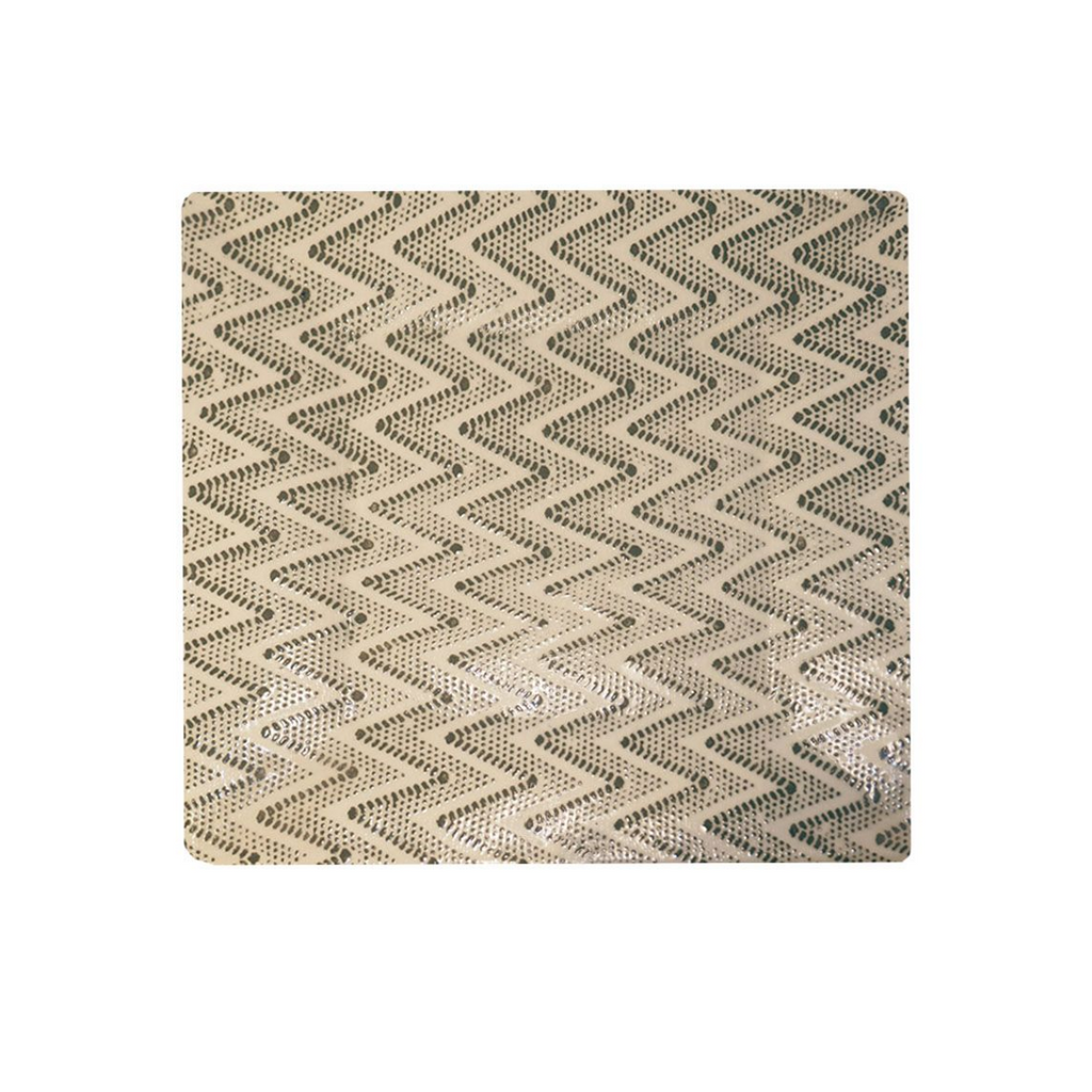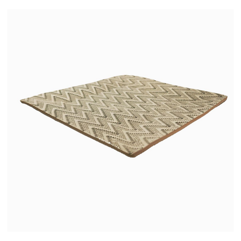 Alive with color and texture, this ceramic square cheese tray by Terrafirma is as functional as it is beautiful. Using fabric and lace as a stencil to create this chevron pattern in the color of charcoal, the large cheese tray is ideal for every day use and will add to your decor. With bold patterns and colors, mix and match with other dinnerware for a unique table setting! Dishwasher safe. Measures 10.5” square x 0.75" tall. Made in the US.