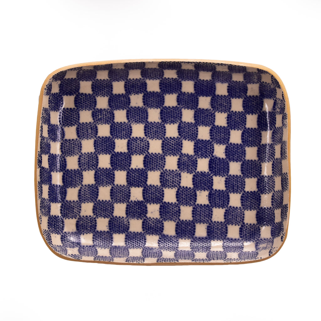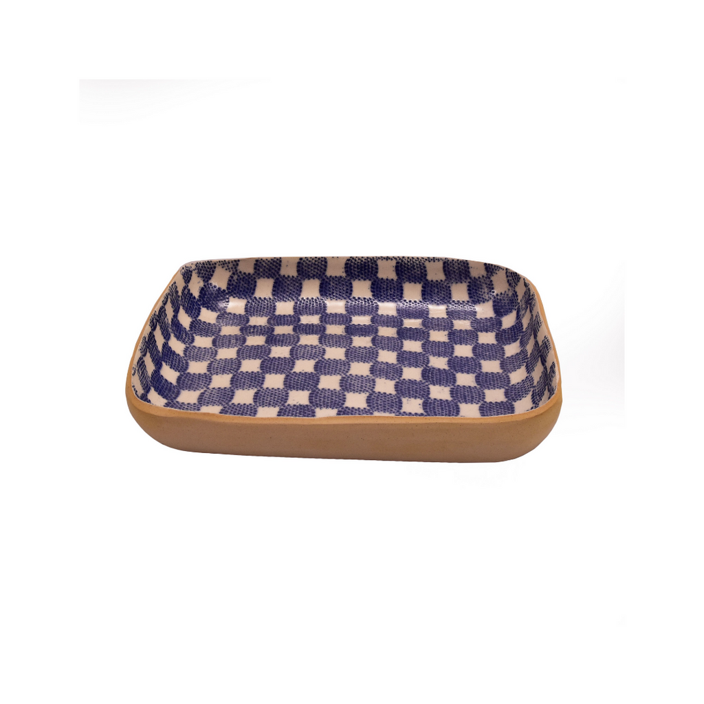 Alive with color and texture, this ceramic tidbit bowl is as functional as it is beautiful. Using fabric and lace as a stencil to create this checker pattern in the rich color of cobalt, the tidbit bowl is ideal for every day use and will add to your decor. With bold patterns and colors, mix and match with other dinnerware for a unique table setting! Dishwasher safe. Measures 8.5 x 7 x 1.5 inches. Made in the US.