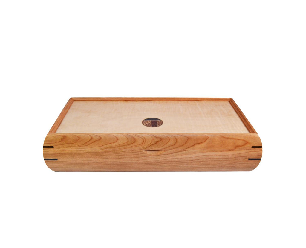 A stunning design paired with precise craftsmanship, this wooden box gives you an elegant yet functional way to store and organize your jewelry. Equipped with multiple compartments and a plush ring insert, this box has a place for all your valuables and space for your rings, necklaces, earrings, and bracelets. Made of cherry and curly maple with a classic inlay of various hardwoods. Measures 13 x 6.5 x 2.75 inches. Handcrafted in the US.