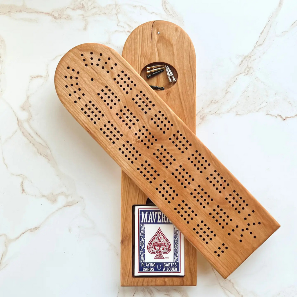 This handmade wooden cribbage board by Camino Woodshop would be the perfect gift for the game-lover in your life or addition to your coffee table! This cribbage board features three standard tracks on a magnetic swivel top, and a storage tray for the six metal pegs and a pack of playing cards. Made of Cherry wood and measures 14" long by 4" wide. Handmade in the US.