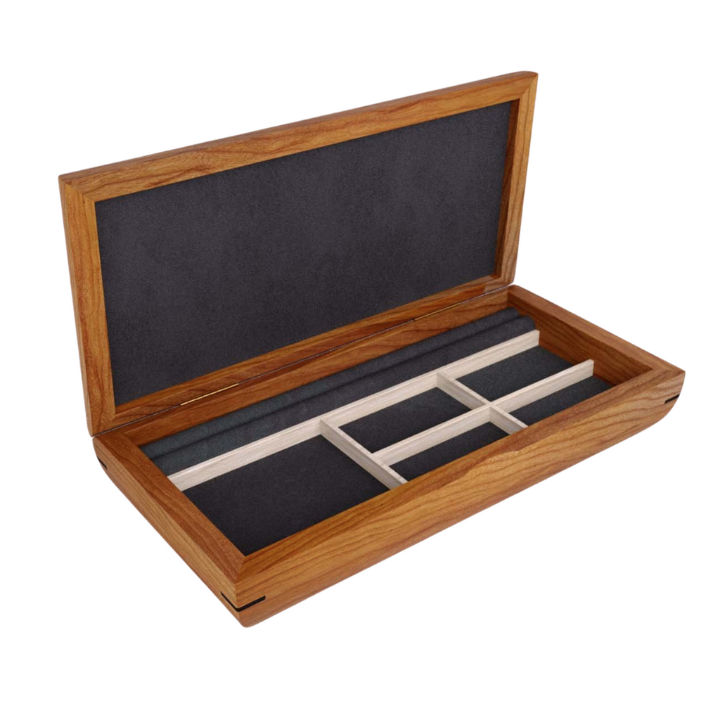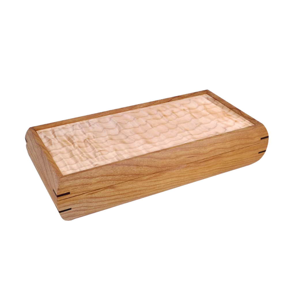 A stunning design paired with precise craftsmanship, this wooden box by Mikutowski Woodworking gives you an elegant yet functional way to store and organize your jewelry. Equipped with 5 plush velvet lined compartments and ring rolls, this box has a place for all your valuables and space for your rings, necklaces, earrings, and bracelets. Made of cherry, quilted maple, and wenge wood. Measures 13L x 6.5W x 2.5H inches. Handcrafted in the US.