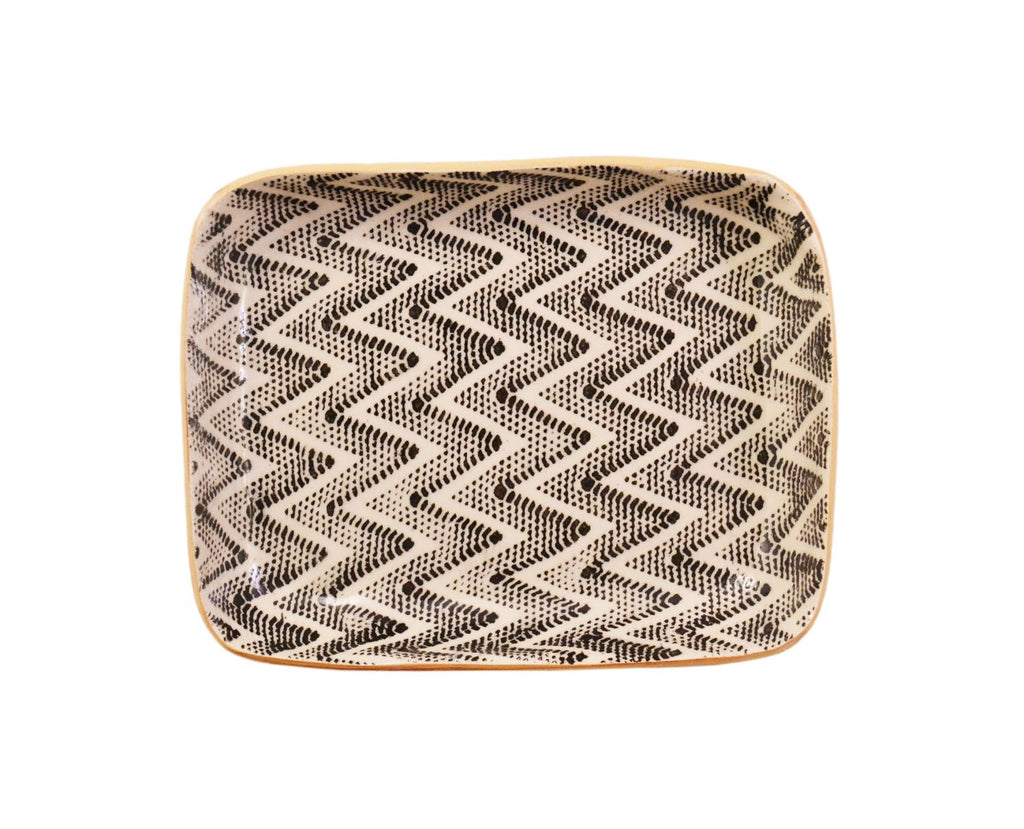 Alive with color and texture, this ceramic tidbit bowl by Terrafirma is as functional as it is beautiful. Using fabric and lace as a stencil to create this chevron pattern in the rich color of black, the tidbit bowl is ideal for every day use and will add to your decor. With bold patterns and colors, mix and match with other dinnerware for a unique table setting! Dishwasher safe. Measures 8.5 x 6.5 x 1.75 inches. Made in the US.
