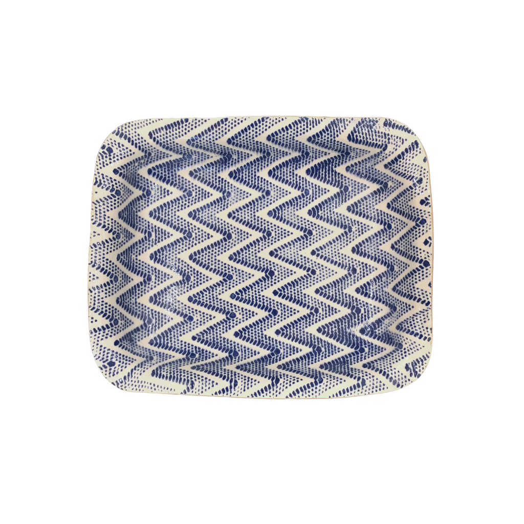 This small vegetable bowl by Terrafirma is functional as it is beautiful. Using fabric and lace as a stencil to create a striking chevron pattern, this ceramic cobalt dish is great for everyday use and for entertaining. Enhance your table and combine with other pieces by the artist for a unique table setting! Dishwasher safe. Measures 9.5" x 8" and is 1.75" deep. Handmade in the US.