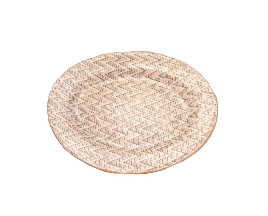 Alive with color and texture, this ceramic plate by Terrafirma is as functional as it is beautiful. Using fabric and lace as a stencil to create this chevron pattern in the rich color of charcoal, the plate is ideal for every day use and will add to your decor. With bold patterns and colors, mix and match with other dinnerware for a unique table setting! Dishwasher safe. Measures 15.25” x 12.5”. Made in the US.