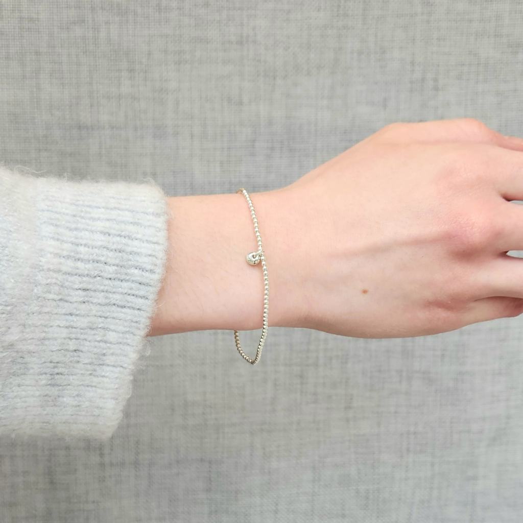 Cast from stones with a hole found on the beaches of Gimli, Manitoba, Canada, Johanna Brierley's jewelry embraces the organic beauty created by nature. Hole stones are believed to channel good luck, and thus the artist creates simple, long-lasting pieces that symbolize luck and fortune. Made with 2mm round silver beads, this stretchie bracelet features the artist's 'chip' sterling silver lucky stone! Bracelet measures 7". Handcrafted in Canada.