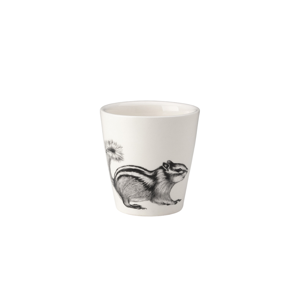 Welcome to the charm and serenity that is nature into your home with a beautiful Laura Zindel piece! Both functional and decorative, this bistro cup adorns the artist's original illustration of a chipmunk. Made from earthenware and glazed with non-toxic, low-fire glazes. Measures 3.5" tall and holds 7 oz liquid. Handcrafted in US. Hand wash only in warm soapy water with a non-abrasive cloth; they should not be placed in the oven, microwave, or dishwasher.
