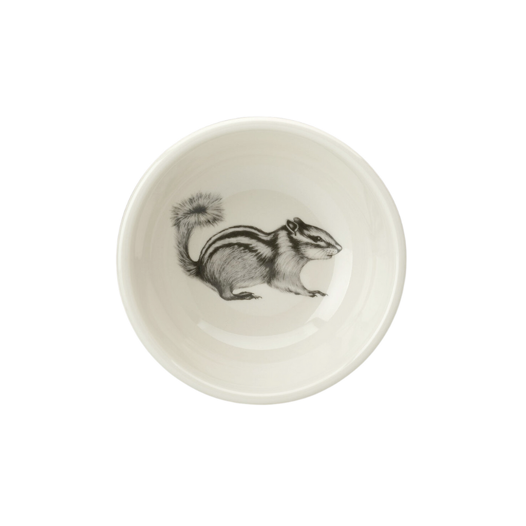 Welcome to the charm and serenity that is nature into your home with a beautiful Laura Zindel piece! Both functional and decorative, this bowl adorns the artist's original illustration of a chipmunk. Made from high-resistance white china. Measures 5.5" wide and 2" deep. Microwave and dishwasher safe. Handcrafted in US.