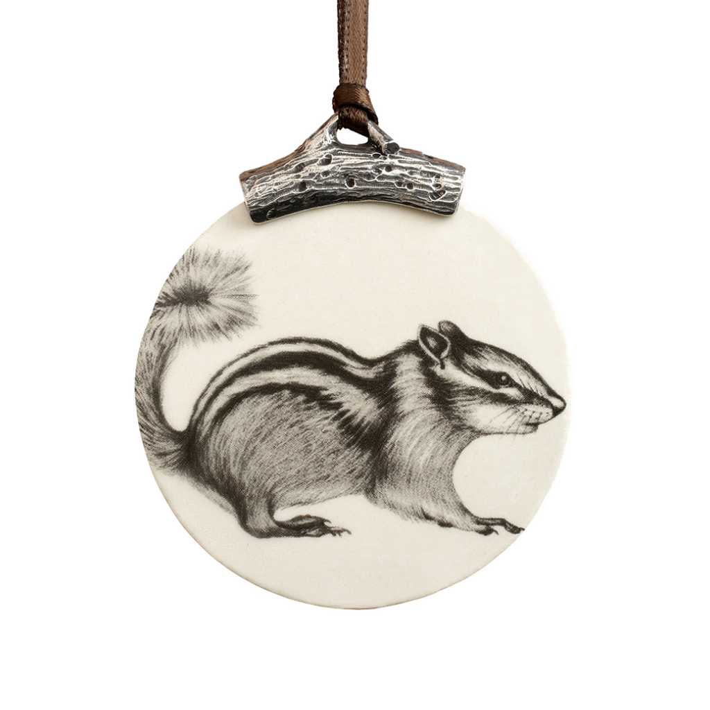 Welcome to the charm and serenity that is nature into your home with a beautiful Laura Zindel piece! This ceramic ornament adorns the artist's original illustration of a chipmunk and is topped with a pewter branch. Measures 2.5 inches in diameter. Handcrafted in US.