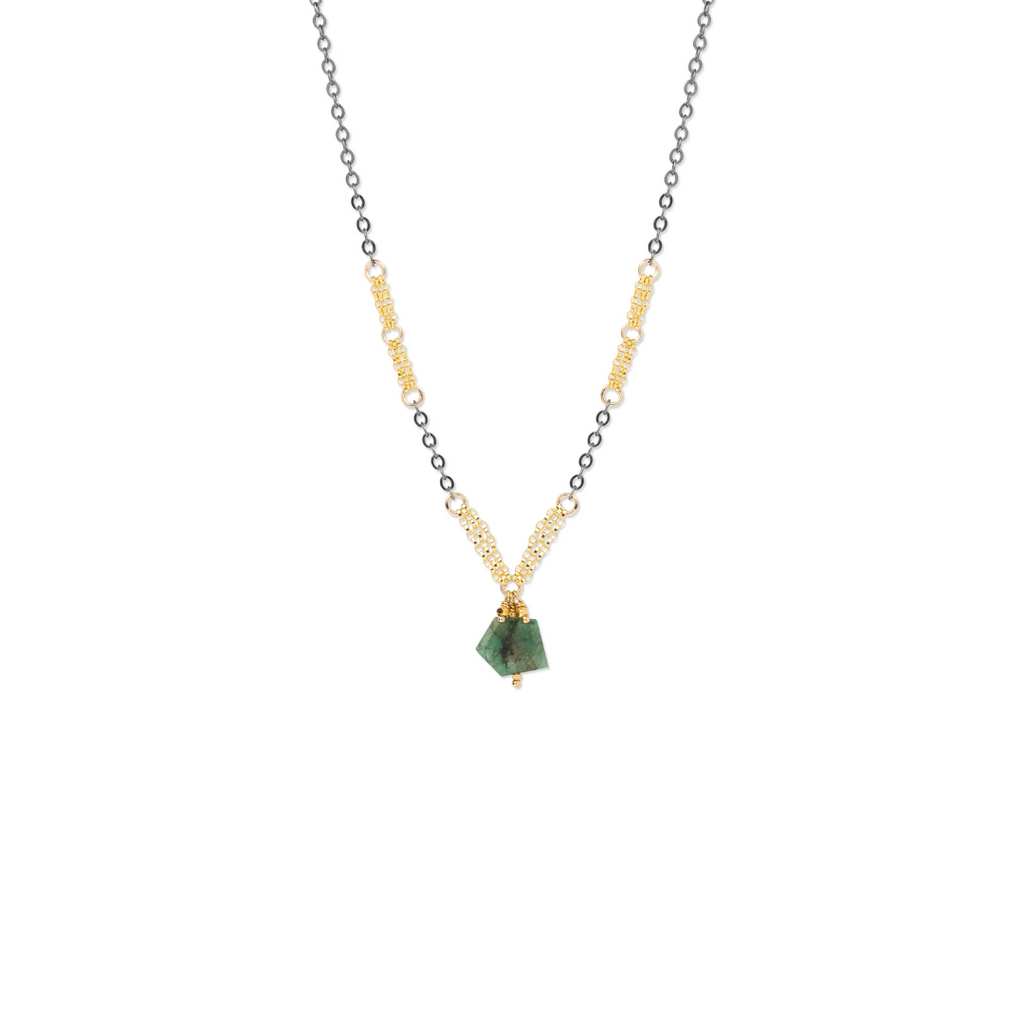 Defined by modern elegance, Kate Winternitz creates delicate, thoughtful jewelry to showcase her love of detail and composition. The Chloe Necklace features a geometric emerald on a mixed metal chain that creates a beautiful contrast. Made from 14kt gold fill and oxidized sterling silver, the pendant measures 0.38" wide. The chain can be worn between 16.5-18.25". Handmade in US.