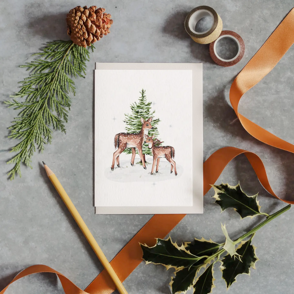 Welcome to the magic that is Sophie Brabbins! This intricately detailed note card features an original watercolor illustration by the artist of a two deer standing in front of a Christmas tree. Printed on luxury FSC card stock, the blank card measures 4x6" and comes with a high quality envelope.