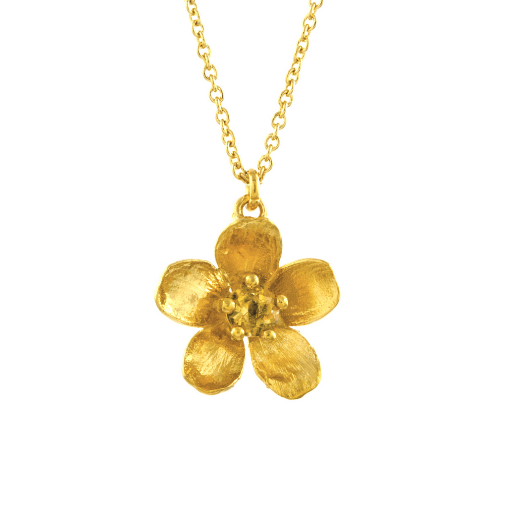 Inspired by nature and nostalgia, every piece of Alex Monroe jewelry is feminine, delicate and quirky. This Buttercup Necklace is made of 22K gold-plated sterling silver with a citrine in the center. Pendant measures 0.6" and the adjustable chain can be worn from 16 to 18 inches. Handmade in the UK.