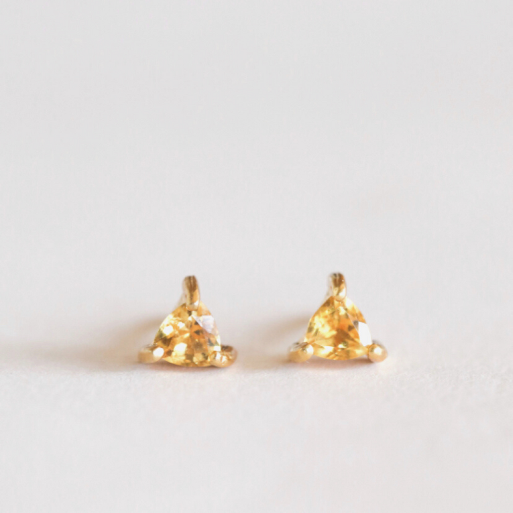 The mini energy gemstone studs by JaxKelly are just what you need to add a little color to your ears. Perfect for everyday, these triangular-shaped citrine are set in a four prong setting of 18ky gold plate over sterling silver. Stone measures approximately 0.3".
