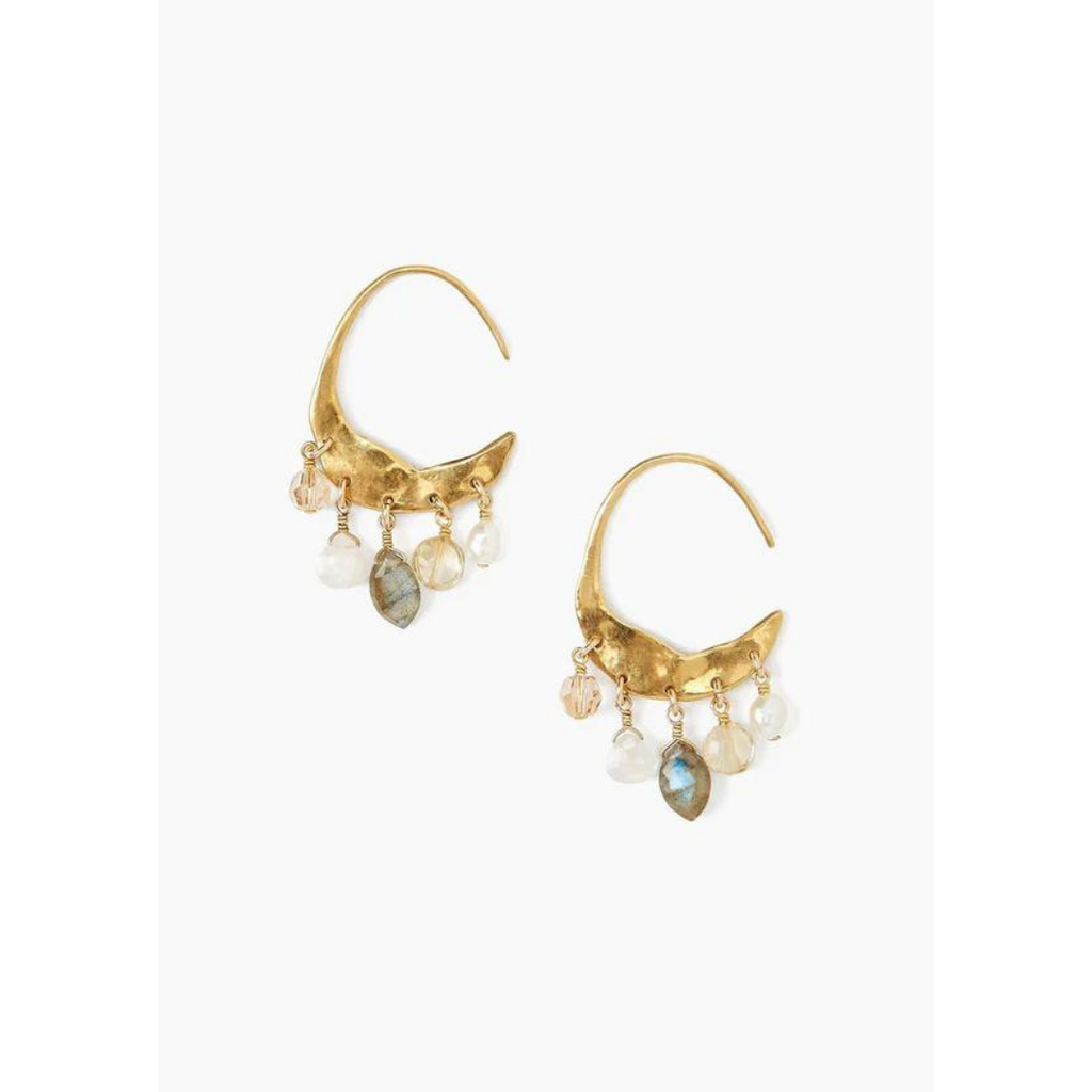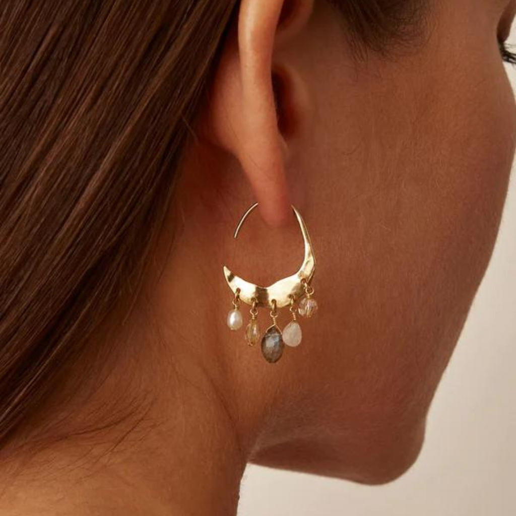 Elegant and festive, these citrine mix earrings are a nice modern take on your classic hoops. These Chan Luu earrings feature a cascade of citrine, labradorite, moonstone, freshwater pearl, and crystal that are suspended from a crescent moon silhouette. Made of gold plated sterling silver, the earrings measure 1.37" long and 0.75" in diameter. Handmade in Vietnam.