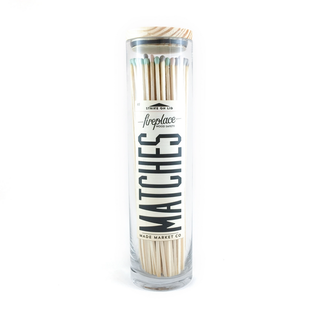 Enjoy adding a pop of color and functionality to your home with Made Market Co. multi-colored tip wooden fireplace matches, displayed in a vintage style glass bottle with striker strip on the lid. Each bottle contains 120 matches and is tightly sealed with a wooden lid. Bottle measures 12.25 inches tall.