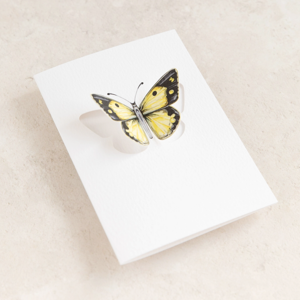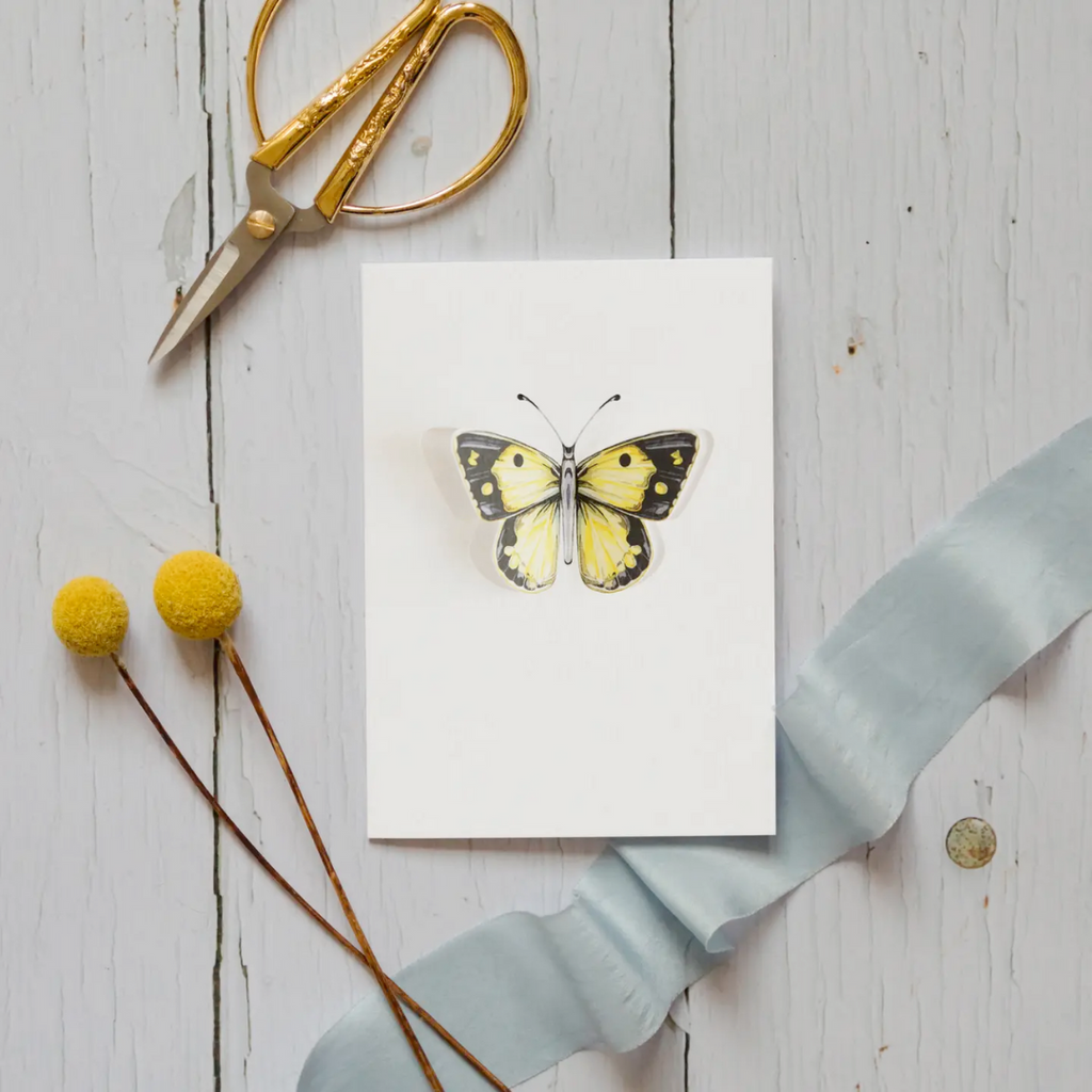 Welcome to the magic that is Sophie Brabbins! This intricately detailed note card features an original watercolor illustration of a clouded yellow butterfly by the artist with delicated 3D pop out wings that seemingly float above the card. Printed on luxury FSC card stock, the blank card measures 4x6" and comes with a high quality envelope. Packaged in a biodegradable cello bag.