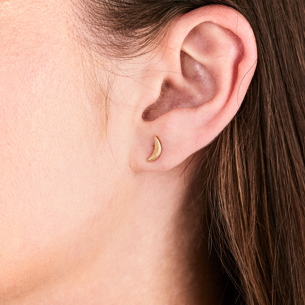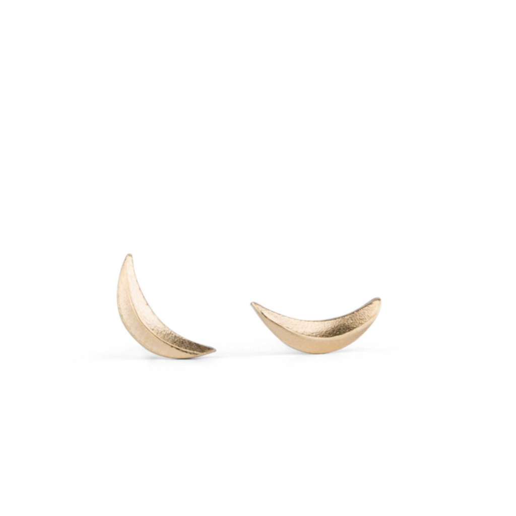 These crescent moon studs by Corey Egan are perfect for everyday wear. They are made of 14k yellow gold and have a matte finish with a polished ridge. Measure approximately 3/8" inches long and 1/8" wide. Handcrafted in US.