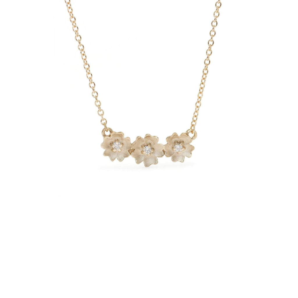 This bar necklace by Megan Thorne is made of 18K yellow gold, and features three white diamonds (.45ctw) set in the center of each Buttercup. Measures 0.63" wide and the chain measures 16.5" long. Handmade in US.