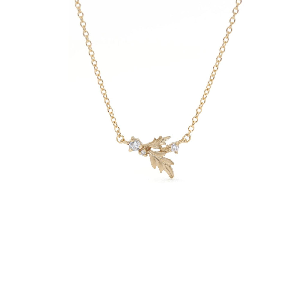 This necklace by Megan Thorne is made of 18K yellow gold, and features three white diamonds (.06ctw) accented with handcarved leaves. Measures 0.5" wide and the chain measures 16.5" long. Handmade in US.