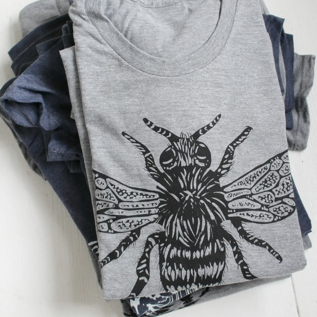Welcome to the magical world of Hearth and Harrow! Now you can wear your favorite tea towel friends on a T-shirt! This tee features the artist's original honeybee design, hand printed using environmentally friendly water-based ink. The T-shirt is 25% organic US cotton, 50% recycled polyester from plastic bottles, and 25% TENCEL Modal organic cotton Slight variations in print are possible. Care instructions: Machine wash cold, tumble dry. Handmade in US.