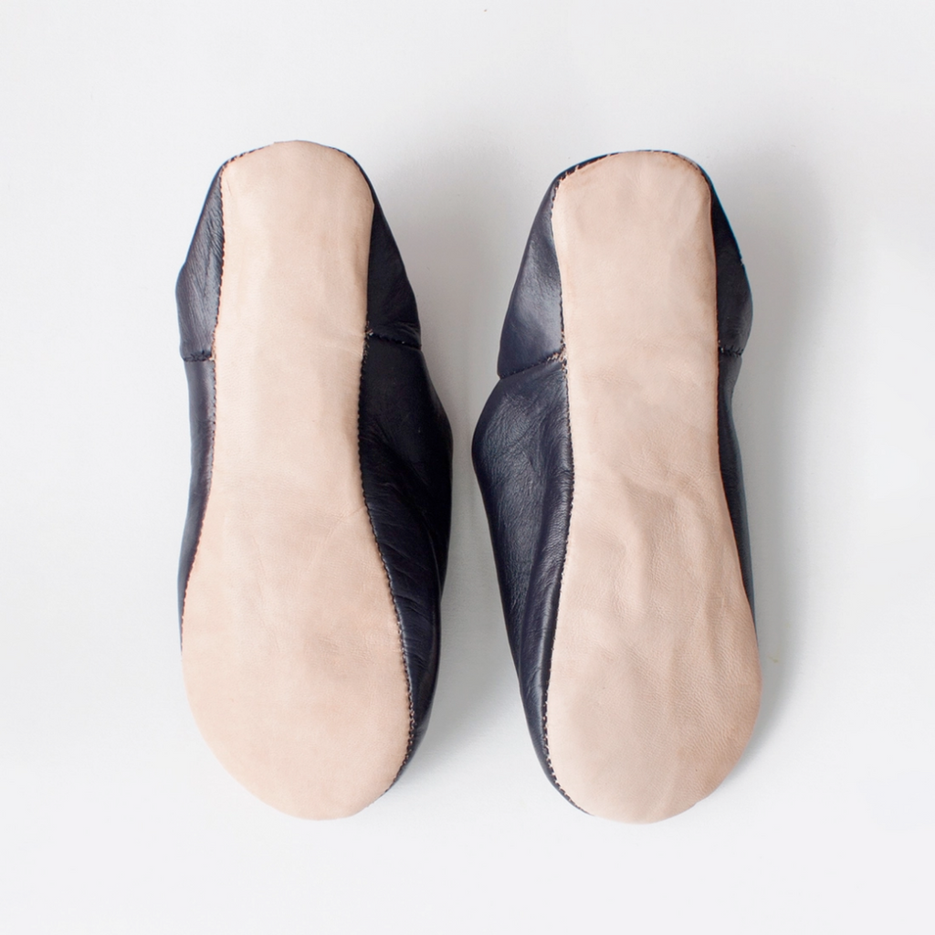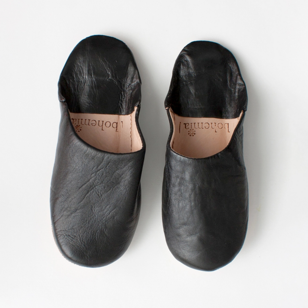 These Bohemia Design slippers are made by a team of highly skilled craftsmen in a family run workshop in Marrakech using traditional techniques. Made of black dyed leather and size men's medium (men's US 10-11). Handmade from the finest quality hides, the leather is cured using organic processes, which may leave a residual scent that will fade once they have had a chance to air out. The leathers are dyed and dried in the sun before being stitched. Minor flaws and imperfections are characteristic of natural materials and traditional methods. CARE: These leather soled slippers are designed for indoor use on smooth, dry surfaces and are not suitable for outdoor or poolside wear. We recommend cleaning your babouche with a dry or slightly damp cloth keeping use of water to an absolute minimum.