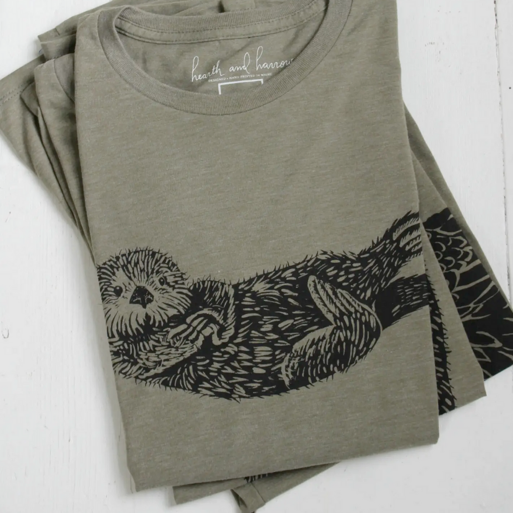Welcome to the magical world of Hearth and Harrow! Now you can wear your favorite tea towel friends on a T-shirt! This tee features the artist's original otter design, hand printed using environmentally friendly water-based ink. The T-shirt is 25% organic US cotton, 50% recycled polyester from plastic bottles, and 25% TENCEL Modal organic cotton Slight variations in print are possible. Care instructions: Machine wash cold, tumble dry. Handmade in US.