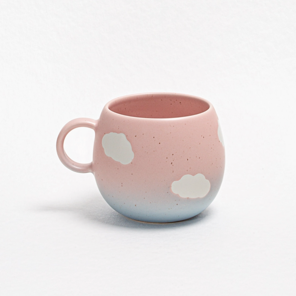 Enjoy the charm and serenity of Egg Back Home's cloud collection! It's like holding the sky in your hands! Handmade from earthenware, this 16 oz mug has a satin pink into blue ombre sunset sky with shiny white clouds and measures approximately 4" wide (not including handle) and 3.75" tall. Microwave and dishwasher safe. Due to its handmade process, the mugs all have natural and unique imperfections. No two are exactly alike. The glaze colors, reactions, and design of the item received may differ from the photo. Handmade in Portugal.