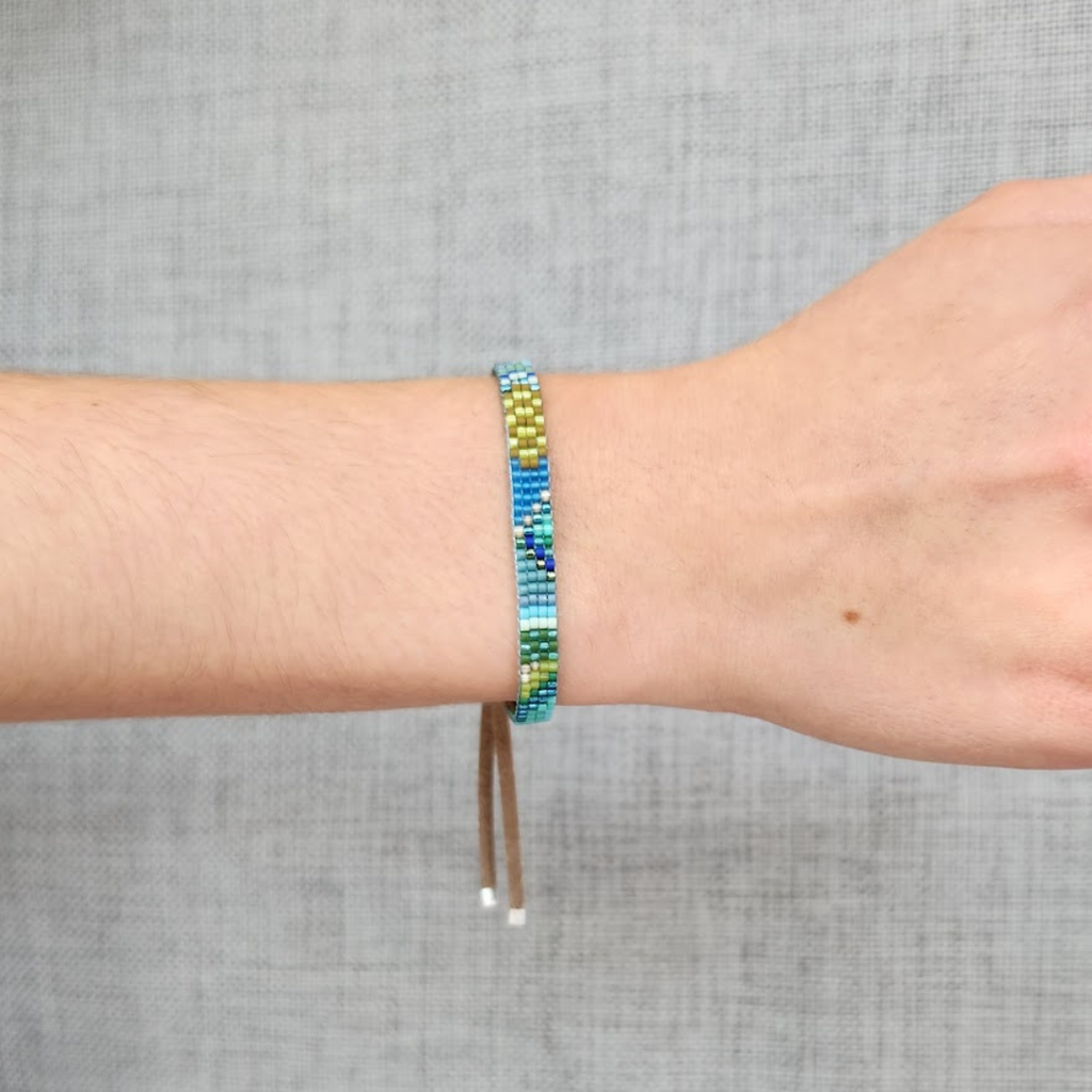 Bring some beautiful colors and intricate details to your personal jewelry collection with Julie Rofman bead bracelets! Made from glass beads handwoven together using a bead loom. With a clasp made of leather and a sterling silver slide bead, each bracelet can be worn on a range of wrist sizes. The Sur bracelet measures 1/4" wide.