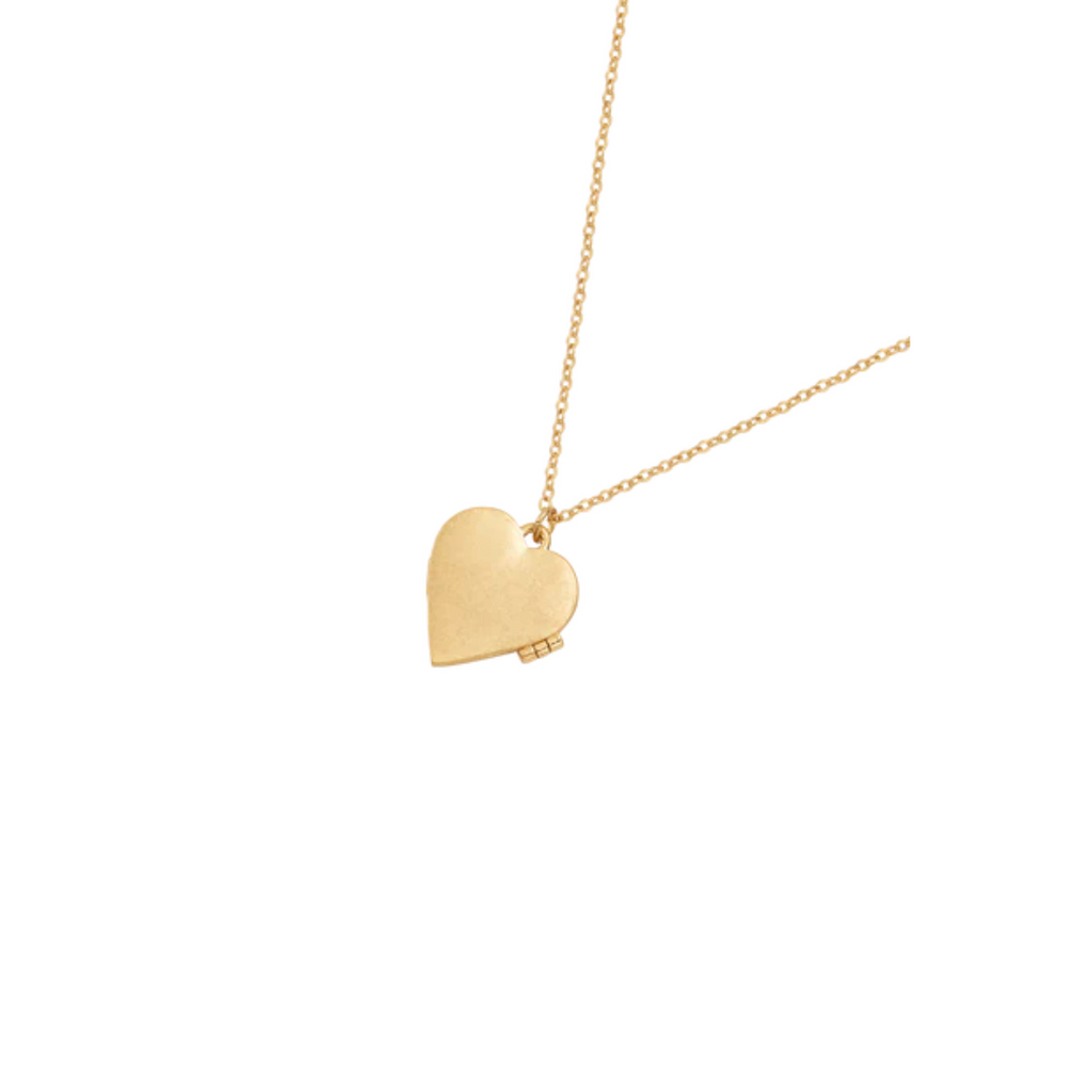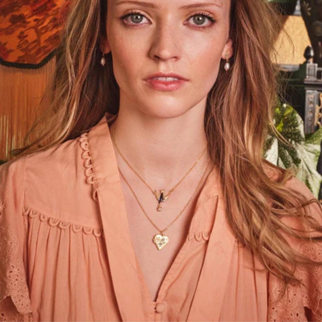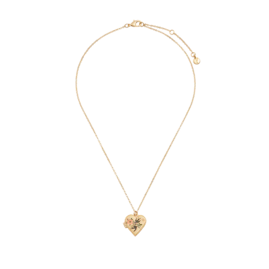 Welcome to the charming world of Fable England! This enchanting hand-painted swallow heart locket makes the most loveable accessory! When open, the locket presents a space to cradle photos of your beloved or other treasured mementos. Yellow gold plated brass with a sparkly cubic zirconia and hand carved detailing, even on the inside! The locket measures 0.63" wide and 0.88" tall. Yellow gold plated chain can be worn at 16/17/18". Designed in England.