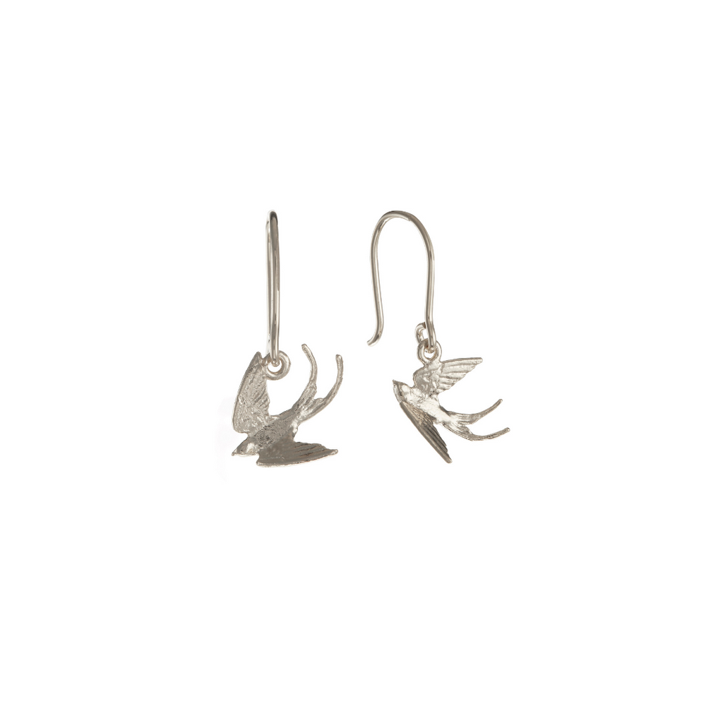 Inspired by nature and nostalgia, every piece of Alex Monroe jewelry is feminine, delicate and quirky. These swooping swallow earrings are made of sterling silver, and the swallow measures 1.18 inches long from the top of the earwire x 0.5 inches wide. Handmade in the UK.