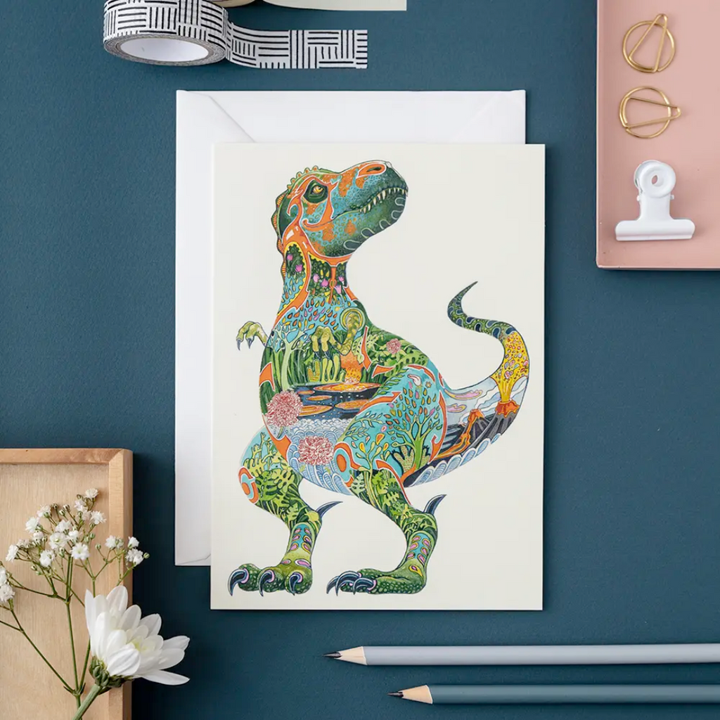 Welcome to the magical world of award-winning artist Daniel Mackie and his animal illustrations! This T-Rex card measures 7" x 5" and is printed on 300gsm board. The blank card comes with an envelope and is protected in a cello bag. Made in London.